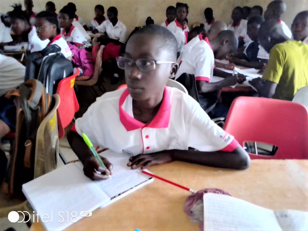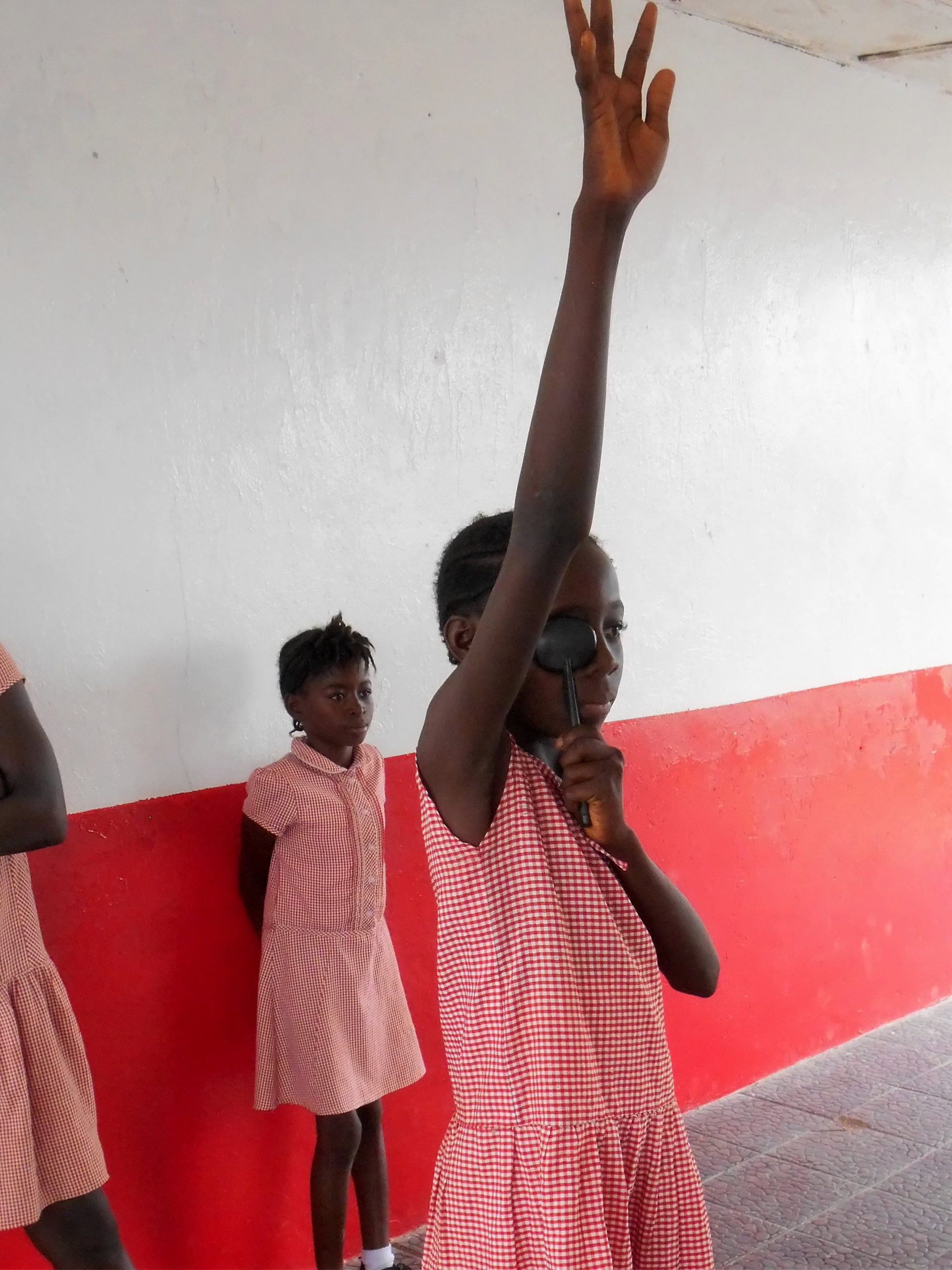 Catherine Thomas carrying out a regular screening session at the school. The next picture shows one of the boys, Mamadu, with his new specs. He is one of the children checked and sent to the eye clinic in Kissy. Related